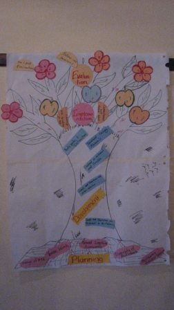 Something didn’t rest well with me. I felt like I was asking them to add on to someone else’s work and that it would be boring. So they did something different: instead of writing down things in a computer, they split up into four different groups and all came up with different ways of showing their good practices. Aruna and Khan made a PowerPoint presentation; Father George, Maria, and Lal (the guy with the umbrella) pretended to do television interviews; Samson, Hameed, Saru and Banasree wrote a nice story about friends who meet in a magical place called Dhulikhel; and Bernat, Lucille and Madan created a tree out of paper and cardboard to show their good practices. You would have liked helping them out with their tree. To me, it was one of my happier moments in any workshop, because each group came up with something fantastic and creative in the space of one hour. It was a great way to end the workshop.